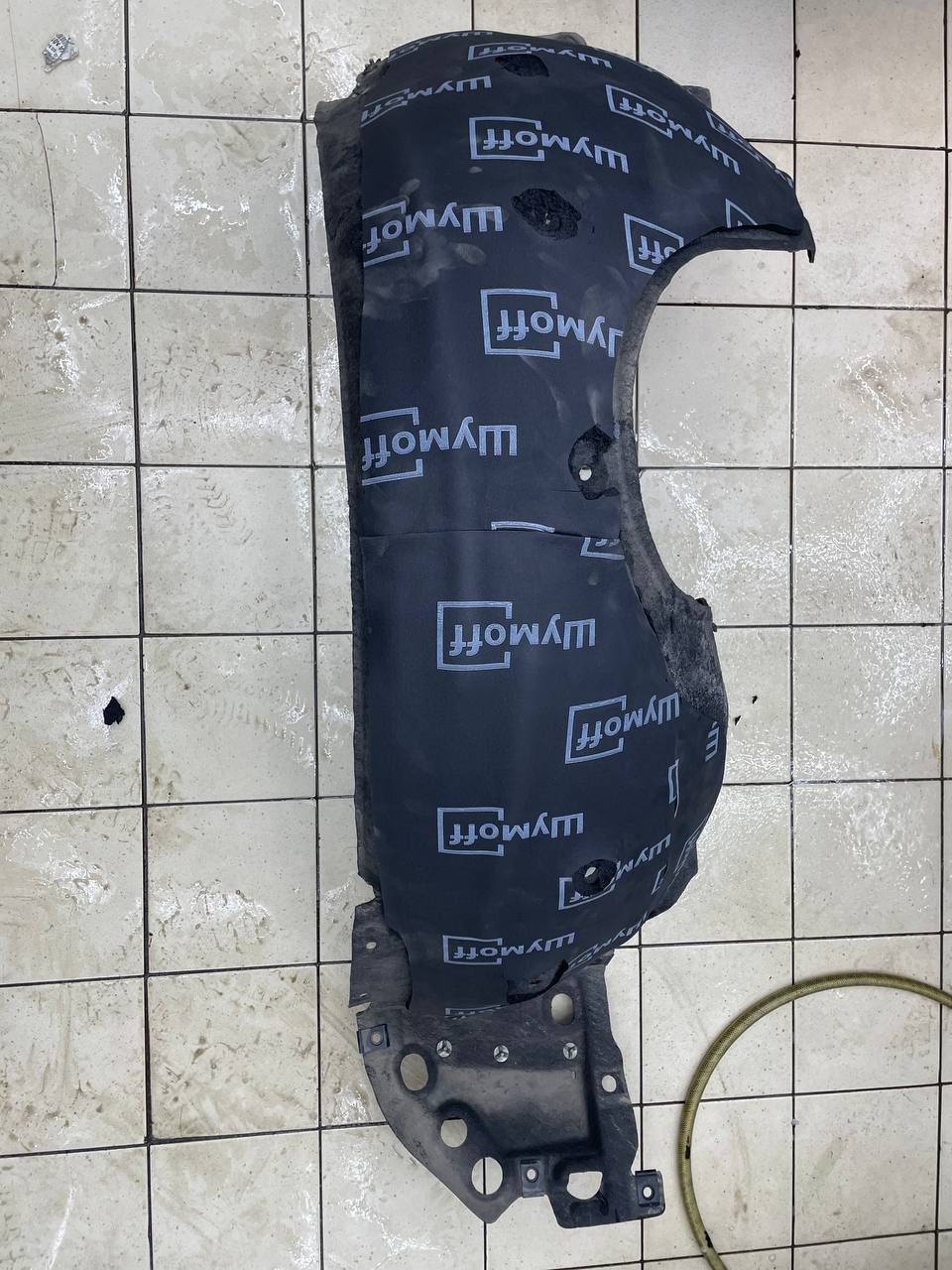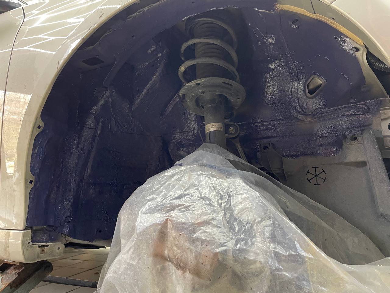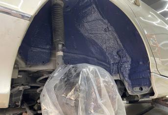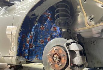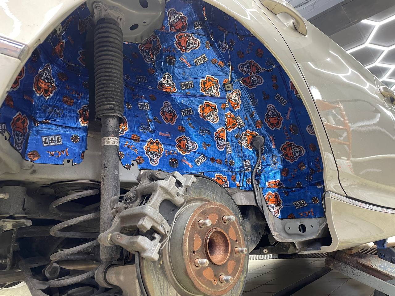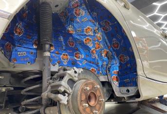 На металл передних арок, сторона к салону, и проем между кузовом и крылом наносим виброизоляцию Шумофф Super Jack. На задние арки Шумофф Super Jack по всей поверхности металла и Комфорт 6. Всё обрабатываем полимером. Все подкрылки фетровые, на них мы монтируем Шумофф Комфорт 6. Сверху всё заливаем жидким полимером для герметезации швов и создания эффекта звукоотрожающей мембраны.