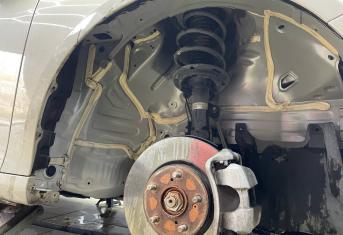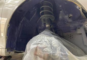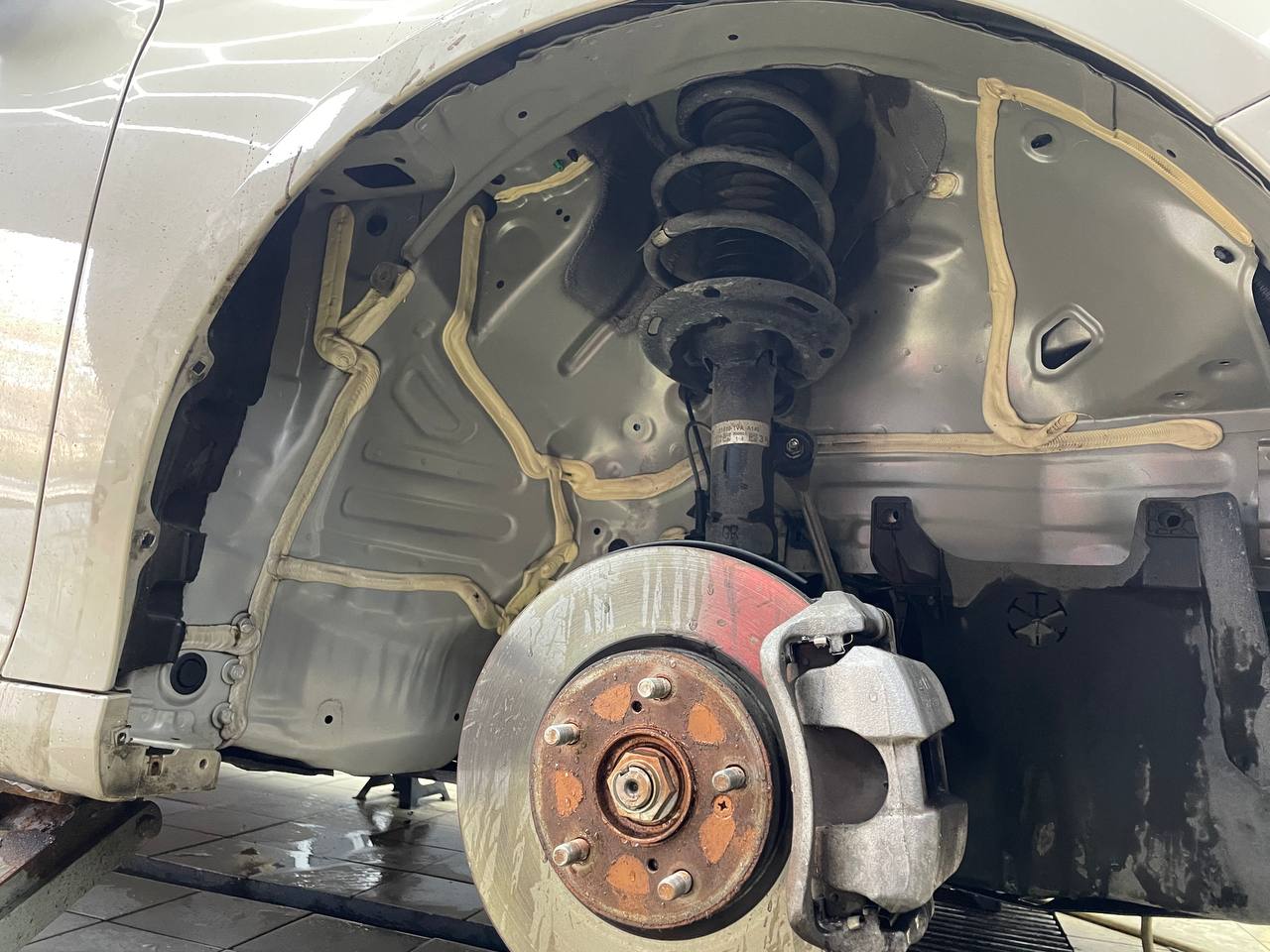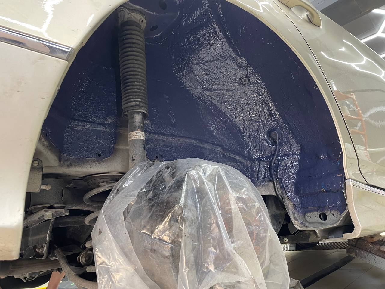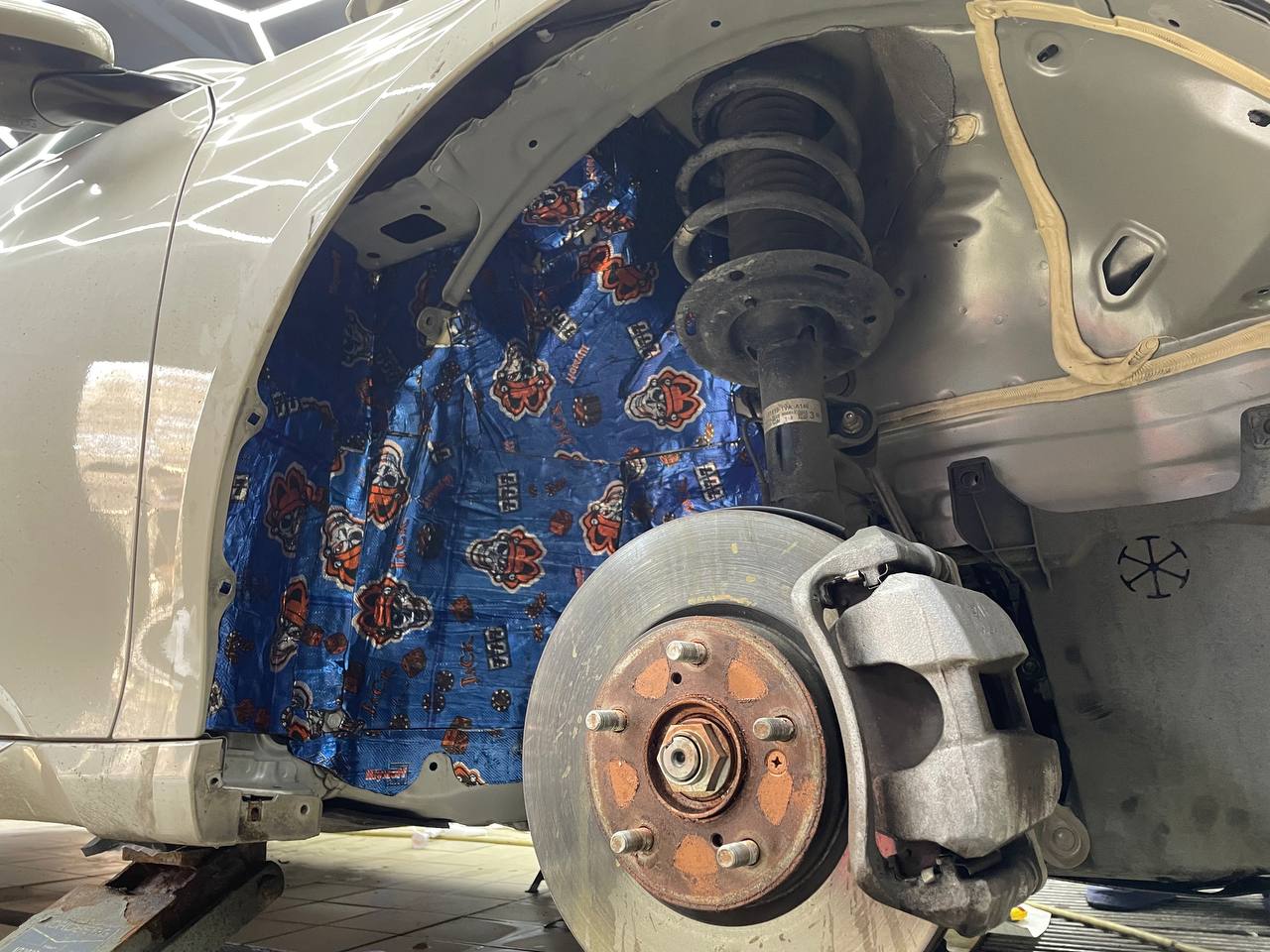 На металл передних арок, сторона к салону, и проем между кузовом и крылом наносим виброизоляцию Шумофф Super Jack. На задние арки Шумофф Super Jack по всей поверхности металла и Комфорт 6. Всё обрабатываем полимером. Все подкрылки фетровые, на них мы монтируем Шумофф Комфорт 6. Сверху всё заливаем жидким полимером для герметезации швов и создания эффекта звукоотрожающей мембраны.