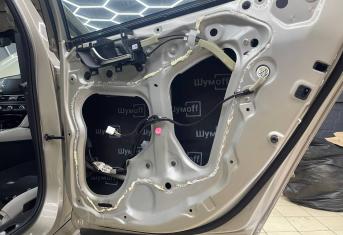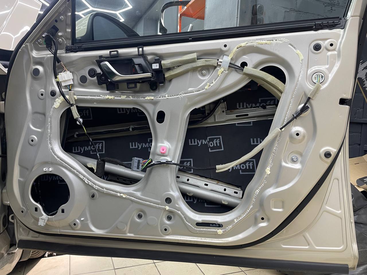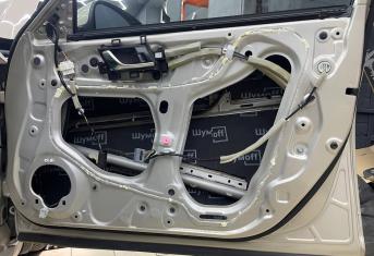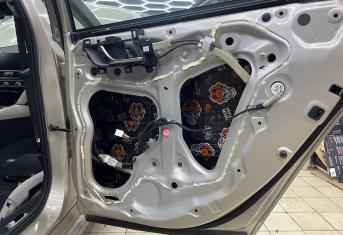 Третьим слоем применяем виброизоляцию Шумофф Jack на внутреннюю стенку двери. Проводку частично обрабатываем Шумофф Specific. Саму обшивку двери оклеиваем виброизоляцией Шумофф М2 и полностью закрываем шумопоглощающим материалом Шумофф Герметон А15. Обратите внимание, как тщательно мы обрабатываем двери виброизоляцией и шумопоглотителем - мы не экономим материал и щедро укладываем его в необходимые места. По канту обшивки двери и клипсы укладываем Шумофф Absorber 5, чтобы избежать раздражительных звуков и не портить ЛКП.