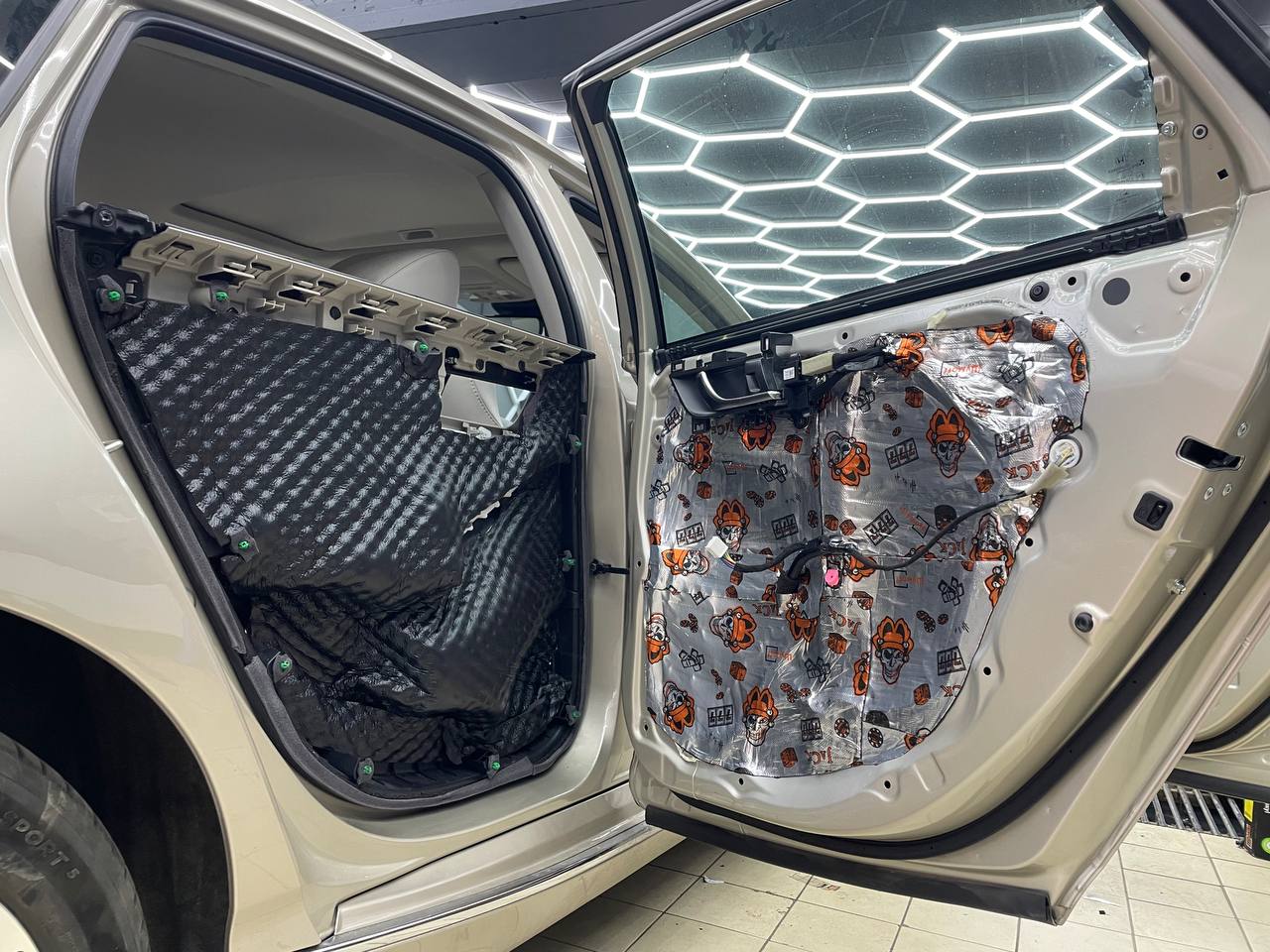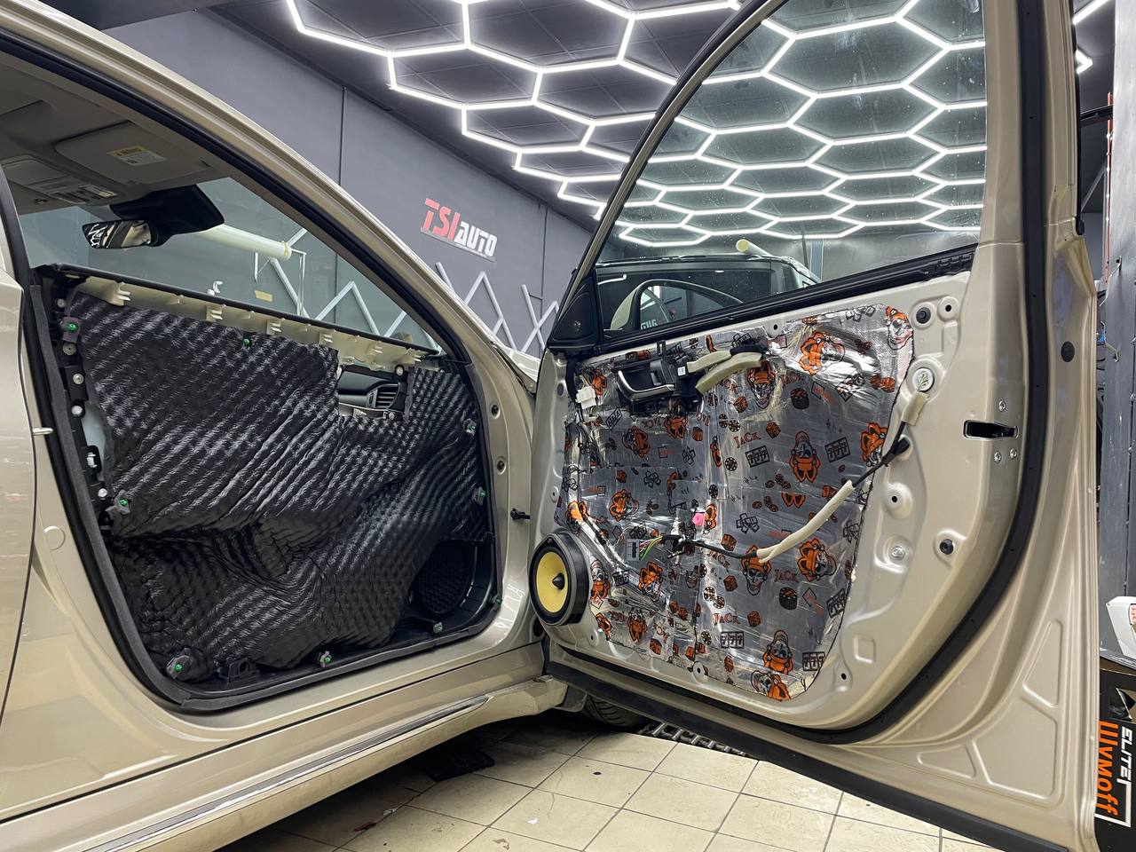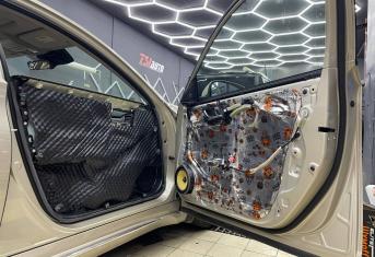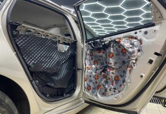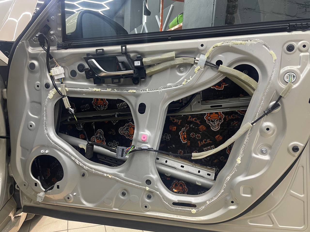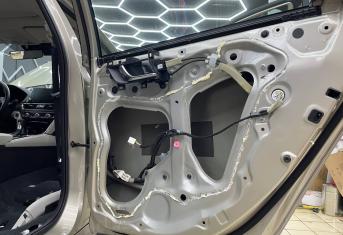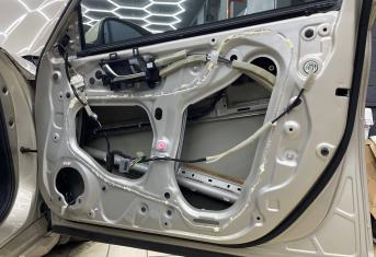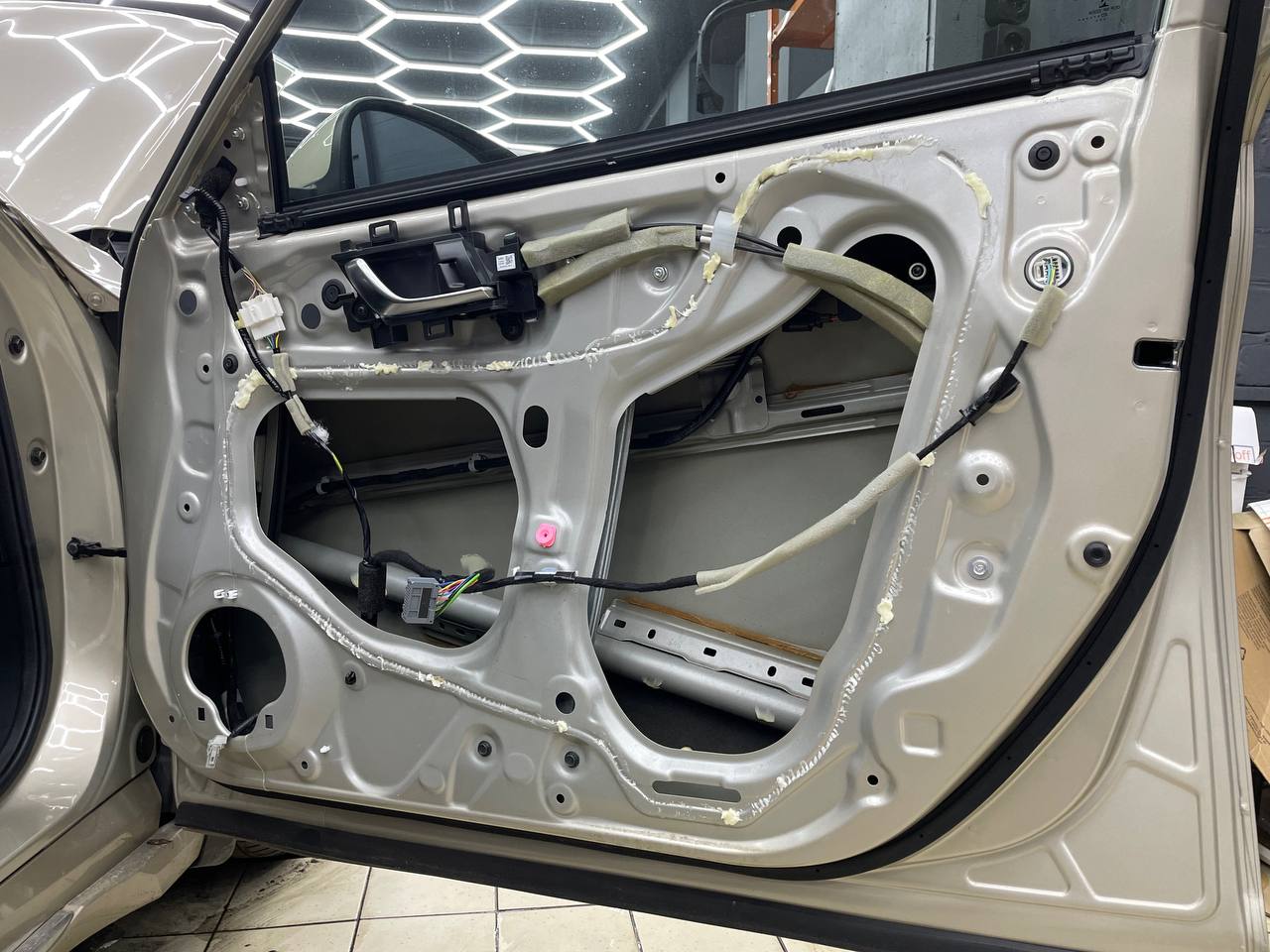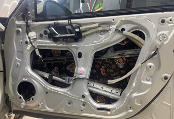 Начинаем работу с разборки дверей, подготовки поверхности и обезжириванию. Все работы по демонтажу пластика выполняются специальным инструментом. Мы гарантируем целостность клипс, креплений и отсутствие различного рода царапин, задиров на обшивках.