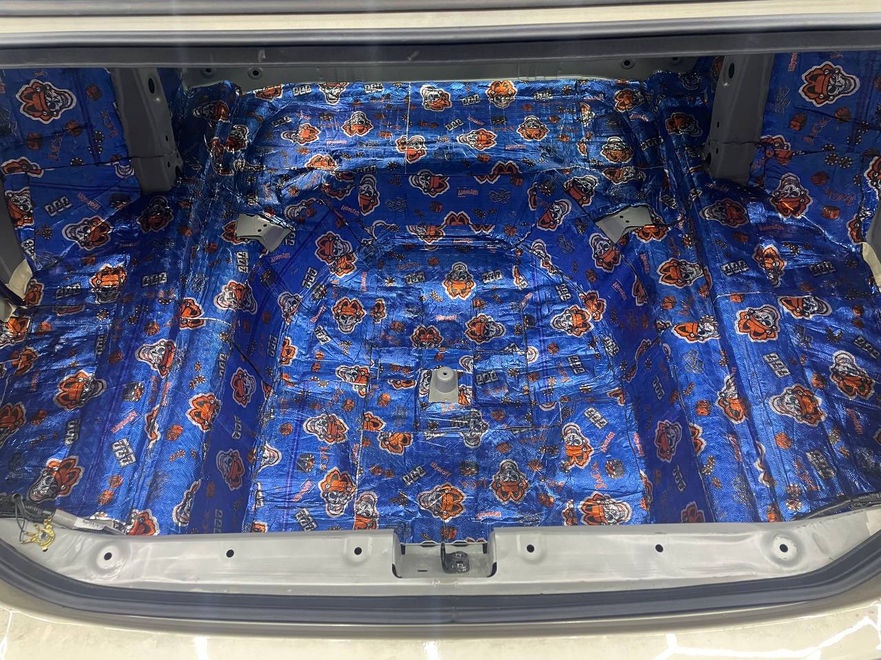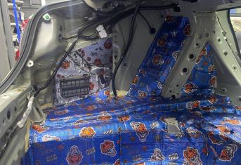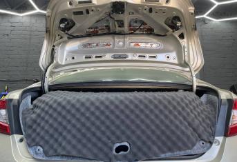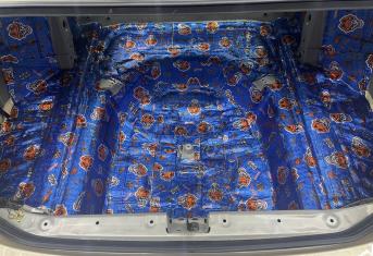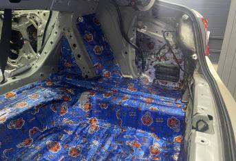 На внешний металл крышки багажника наносим виброизоляцию ШумоФФ Jack. На обшивку монтируем шумопоглотитель Герметон 7.