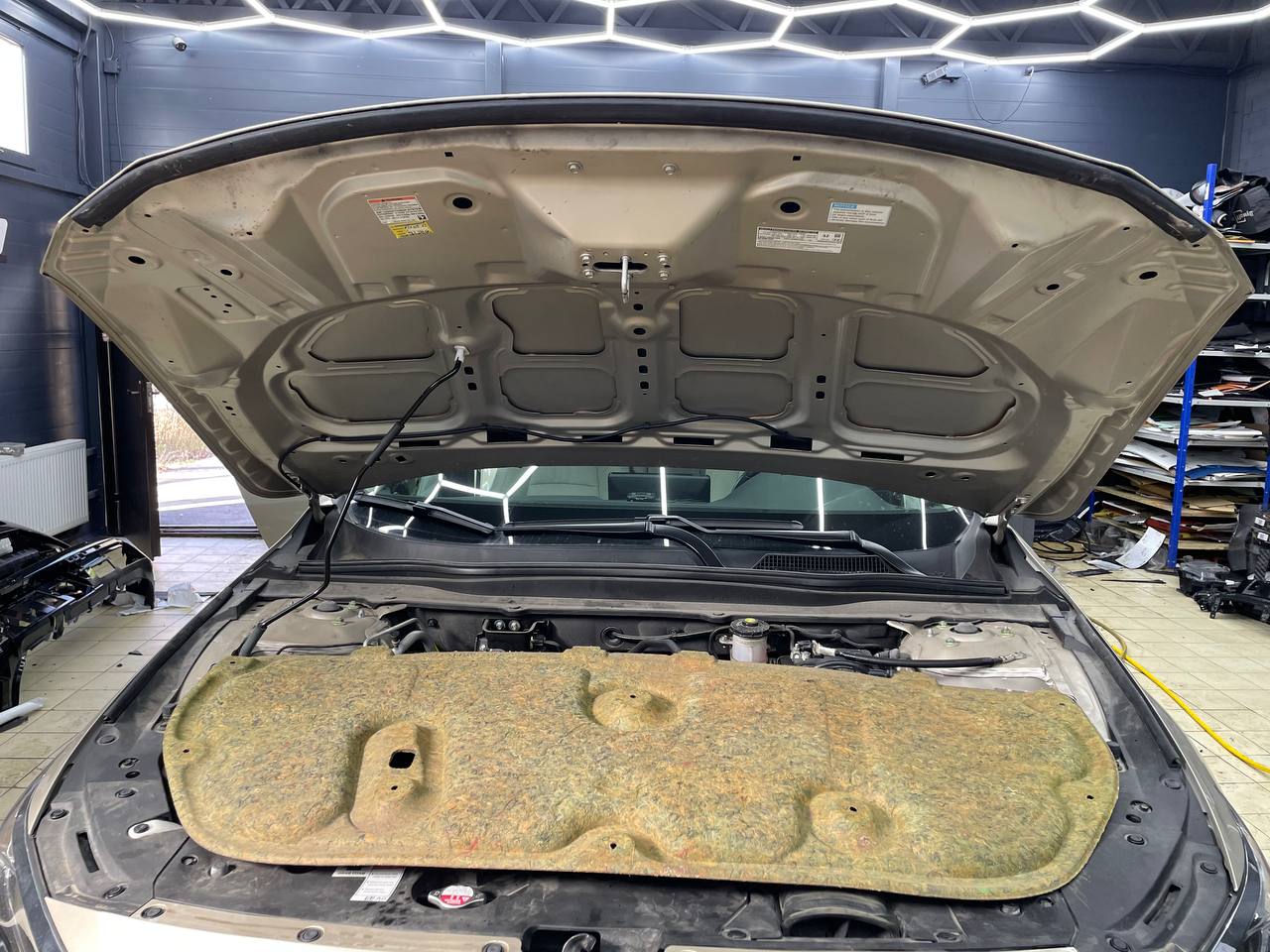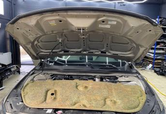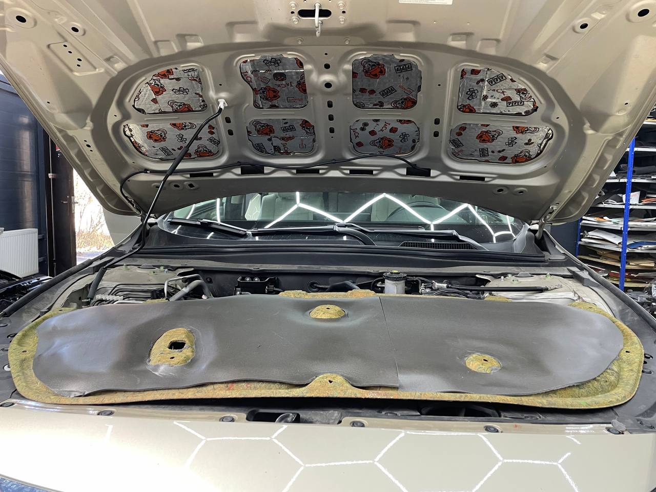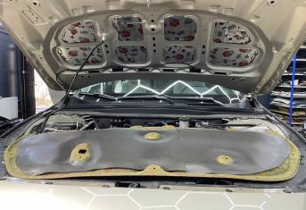 На внешний металл крышки капота наносим виброизоляцию ШумоФФ Jack, на штатную обивку капота монтируем шумотеплоизолятор Шумофф П4. Капот мы клеем бесплатно при заказе комплексной шумоизоляции автомобиля!