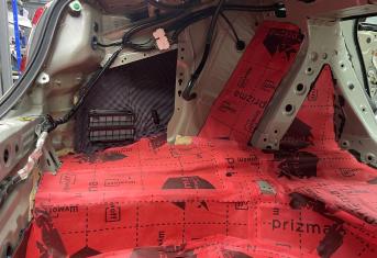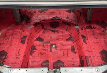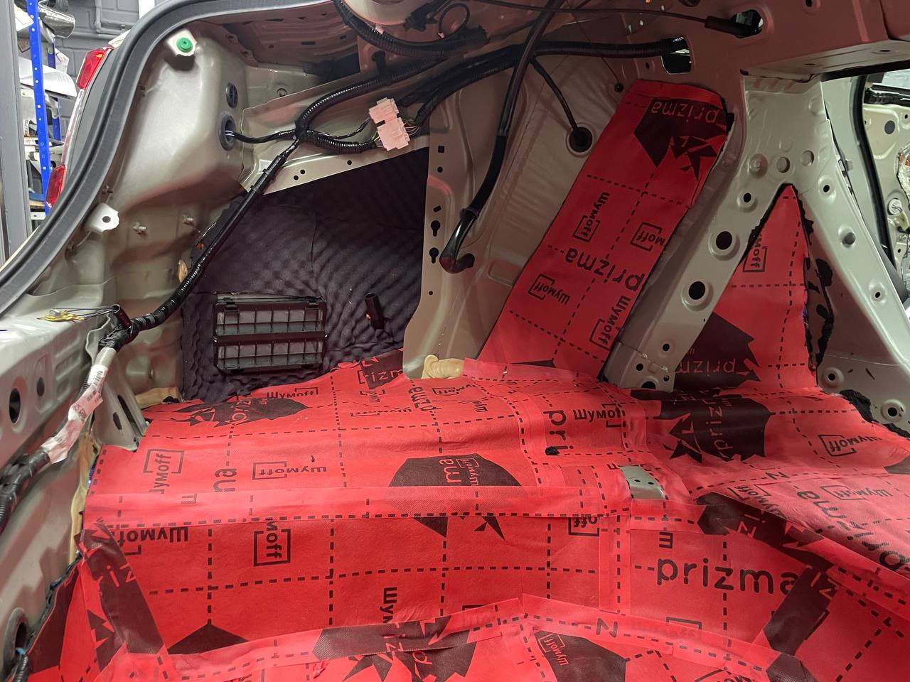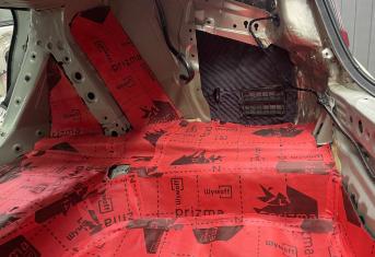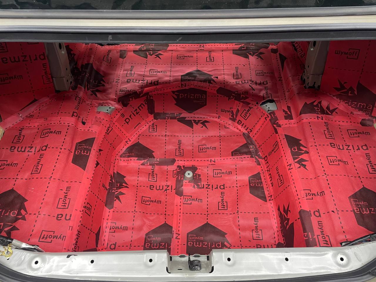Второй слой – Шумофф Prizma шумоизолятор на основе вспененного каучука со звукоотражающей мембраной, это современный и технологичный материал который включает в себя сразу два слоя! Его мы применяем на всю плоскость пола салона и багажника в том числе и задние арки в багажнике. В задние крылья вторым слоем монтируем шумопоглотитель Шумофф Absorber А15, максимально закрывая всю плоскость крыла на сколько это позволяет конструкция автомобиля.