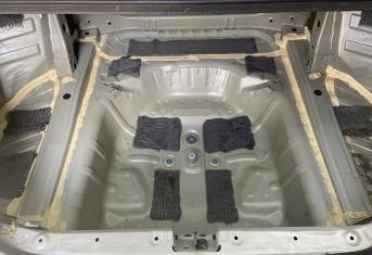 Приступаем к работам с полом, на разборку всего салона уходит около 1 часа. После чего мы подготавливаем поверхность, очистив ее от пыли и предварительно обезжирив. Штатная виброизоляция хорошо держится и её мы не демонтировали.
