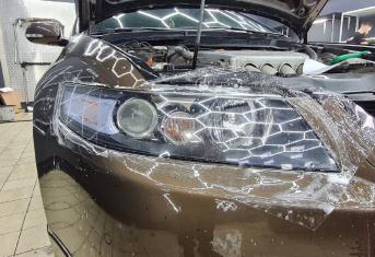 При увеличении пробега автомобиля наблюдается потеря прозрачности стекол, что влечёт за собой уменьшение светопропускания и может стать риском для безопасности на дороге. Honda Accord был доставлен для выполнения работ по восстановлению прозрачности фар и их последующей защиты полиуретановой пленкой.