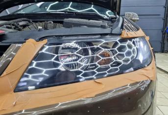 - Далее необходимо защитить фары. При абразивной полировке мы сняли часть лака с фар, стекла стали подвержены к помутнению. Применяем полиуретановую пленку NAR PPF с гидрофобным эффектом, толщиной 190 микрон, и керамическим слоем.