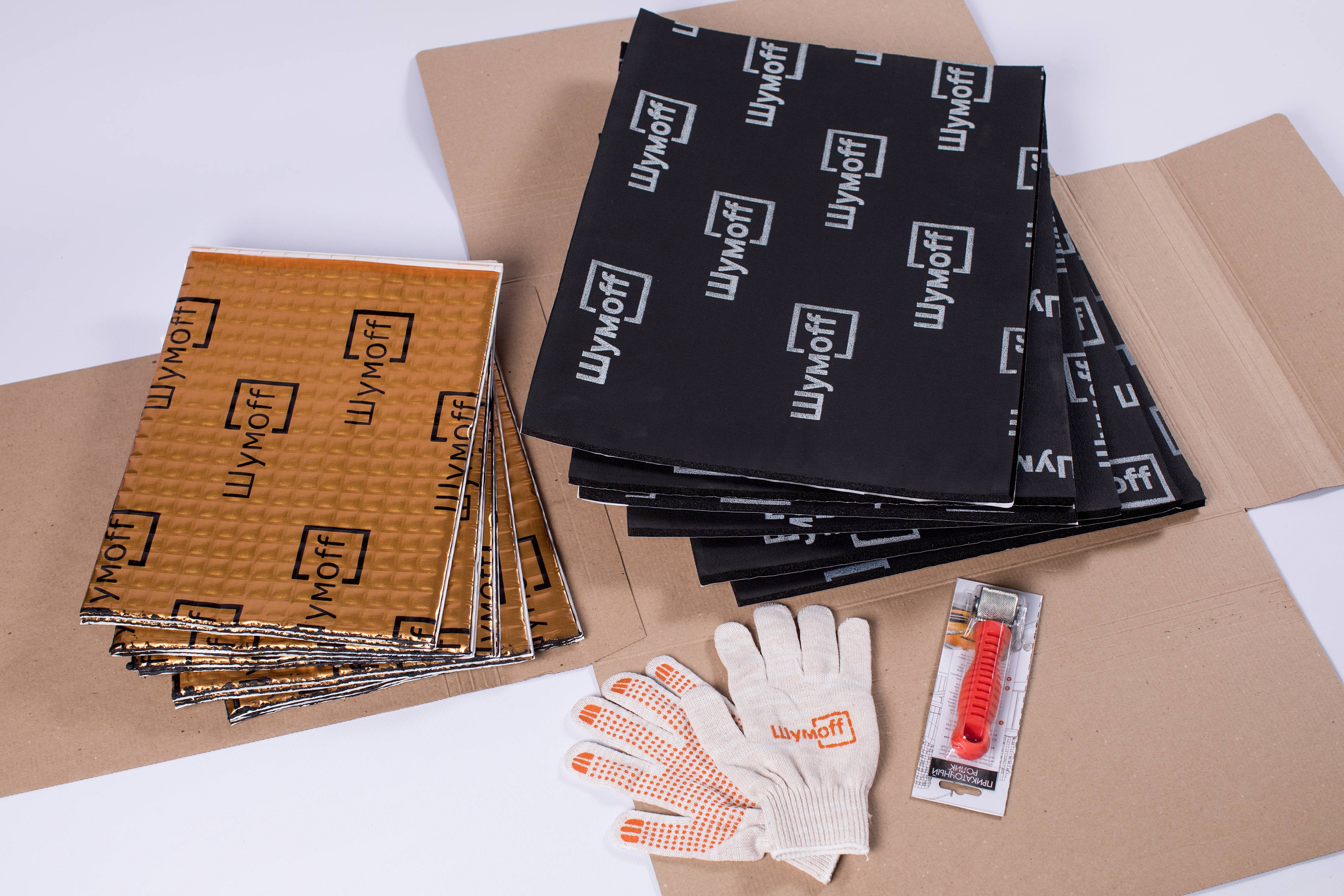 Набор для шумоизоляции пластиковых труб — В комплекте 11 листов виброизоляции, 6 листов тепло-звукоизоляционных материалов, ролик и перчатки.