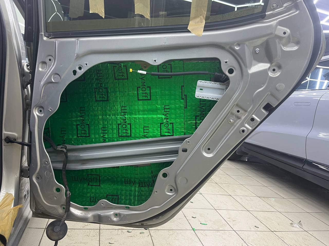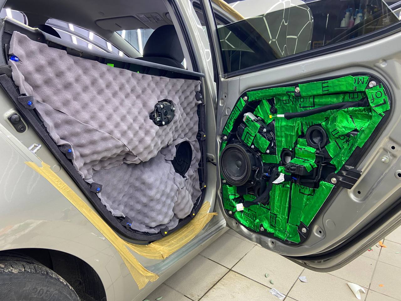 Вторую стенку двери обрабатываем Шумофф М2. Саму обшивку двери локально оклеиваем виброизоляцией Шумофф М2 для снижения резонанса пластика и полностью закрываем новым шумопоглощающим материалом от компании Шумофф, это Ultimat W17. По канту обшивки двери укладываем Шумофф Absorber 5, а на открытую проводку Шумофф Specific.