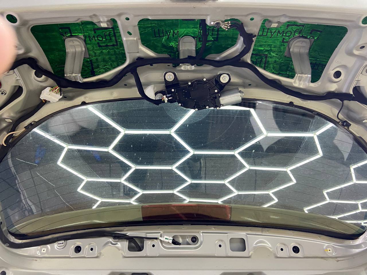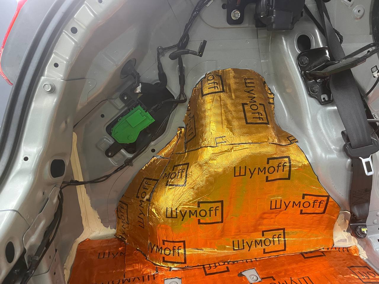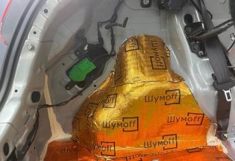 На крышку багажника укладываем виброизоляцию Шумофф М2. На обшивку Шумофф Flex A15.