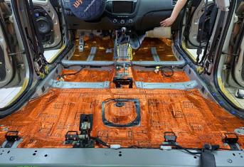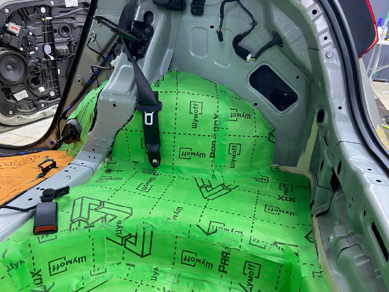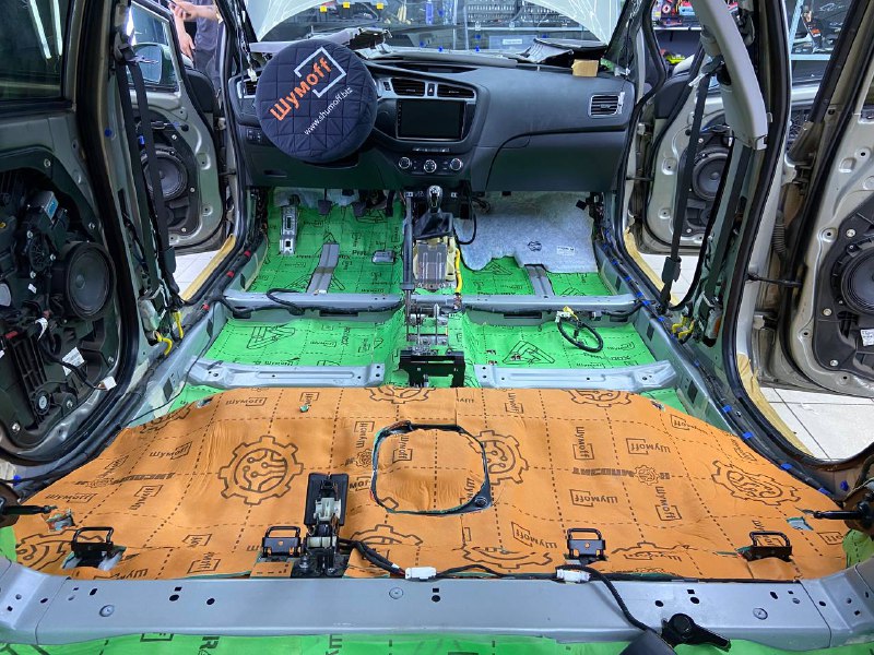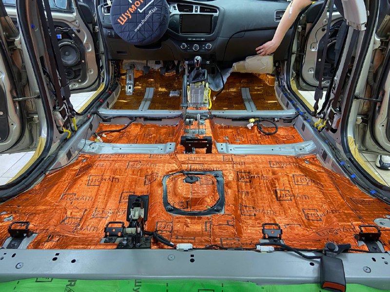 Первым слоем укладывается виброизоляция Шумофф М4, М3 и М2, разница в толщине, весе и зоне применения материала. Шумофф М4 пойдет на переднюю часть пола и задние арки. Остальную поверхность обрабатываем Шумофф М3. М2 отлично подходит для задних крыльев. Поверх усилителей она не наносится, чтобы избежать парникового эффекта и появлению влаги под ковром.