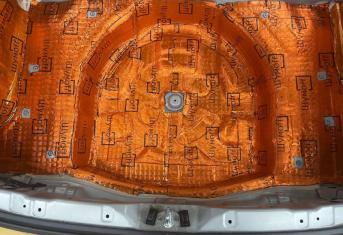 В технологические отверстия капота, на внешний металл, монтируем виброизоляцию Шумофф М2 и на штатную обивку применяем шумо-теплоизоляцию Practik Base 4.
