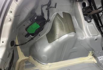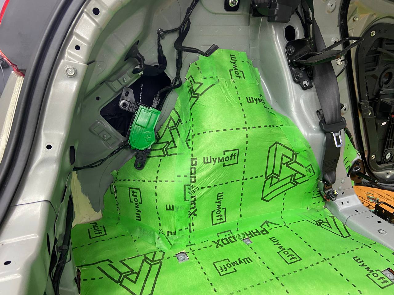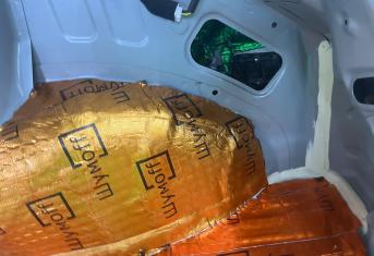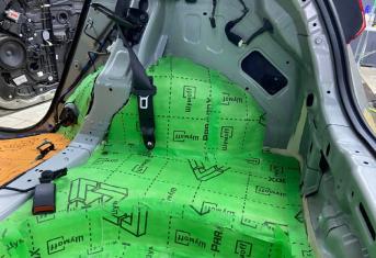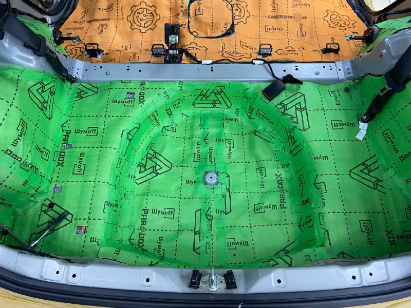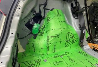 Вторым слоем для шумоизоляции пола мы используем Шумофф Парадокс для всей нижней части салона за исключением места под задним сидением, туда монтируем Шумофф Композит, чтобы избежать проблем со установкой заднего сидения. Это новые материалы от производителя Шумофф, которые включают в себя сразу два слоя и кратно повышают результативность. На задние крылья наносим шумопоглотитель Practick Flex A15.