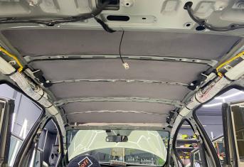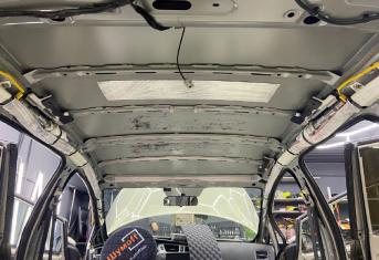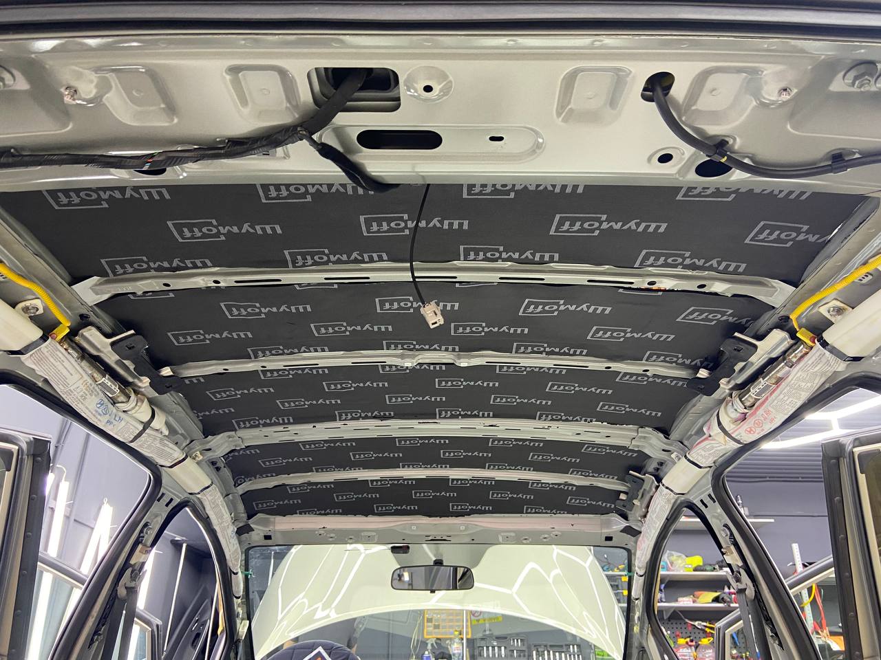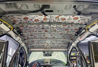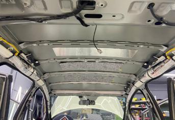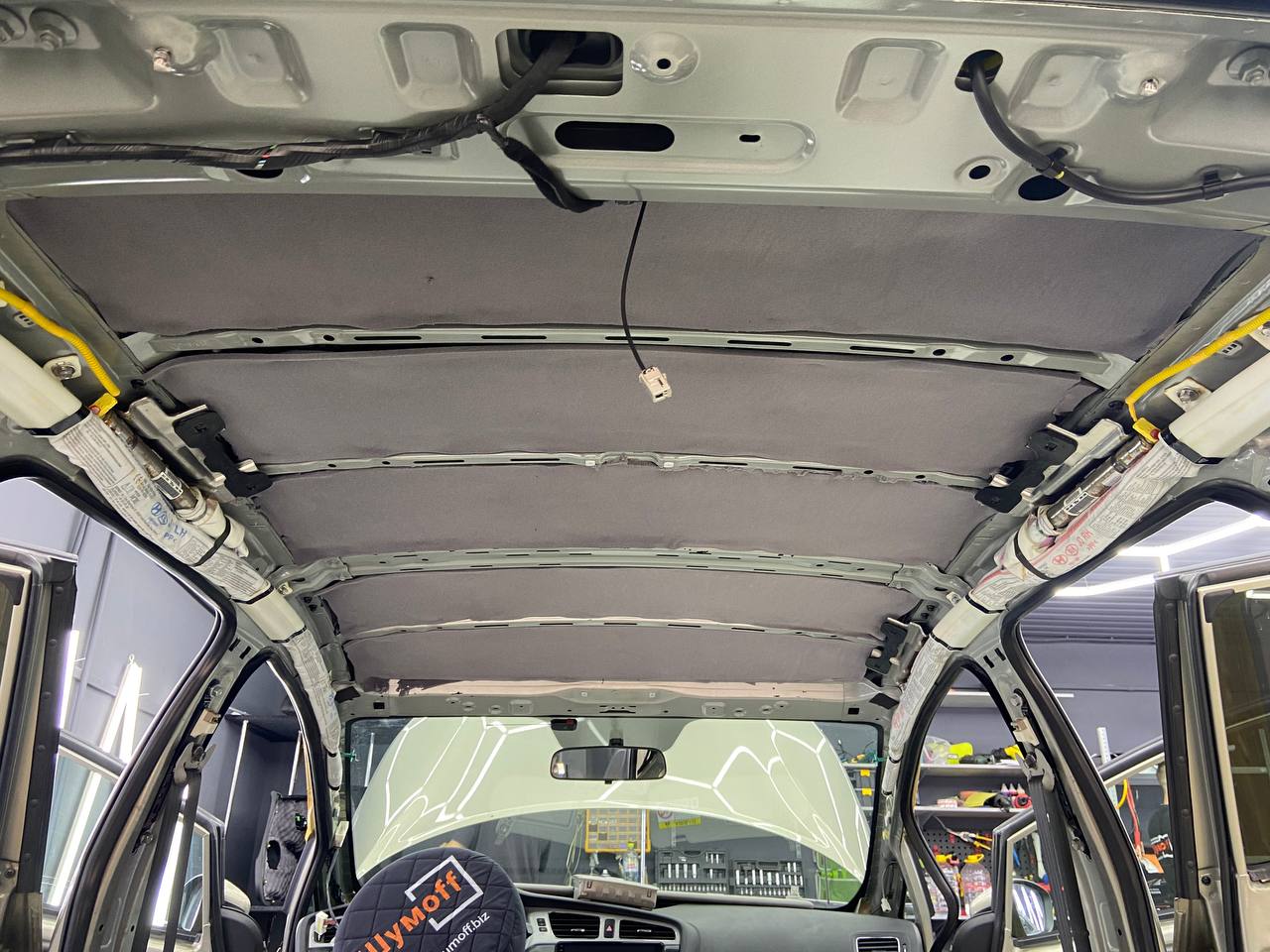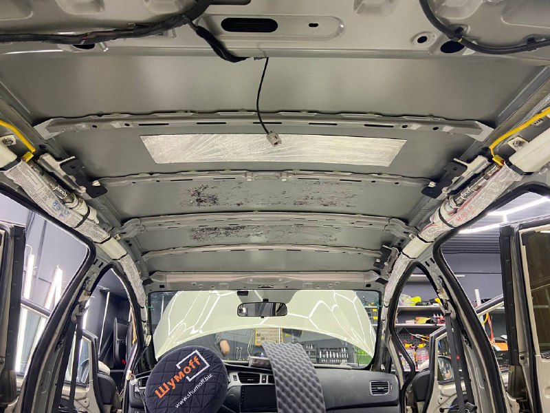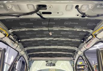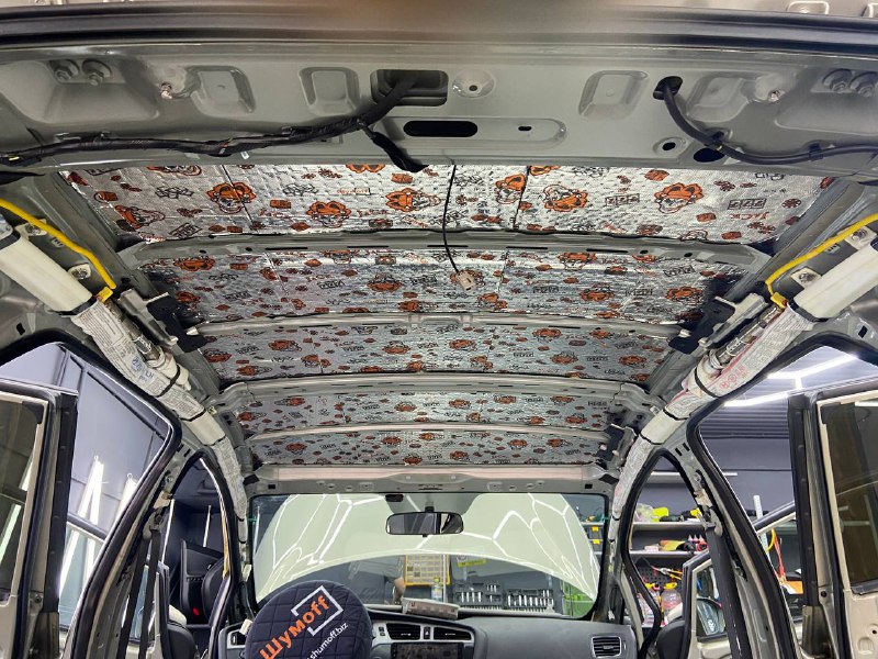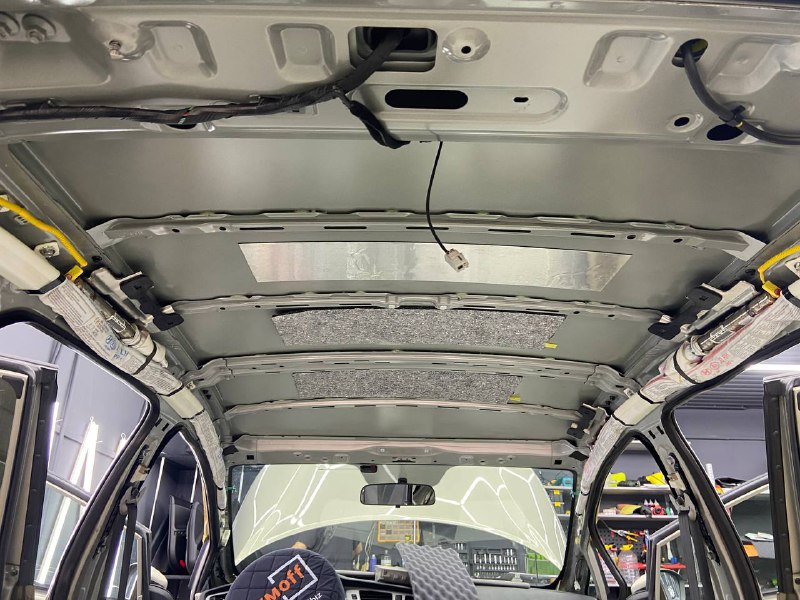 Первым слоем на крышу монтируем виброизоляцию Шумофф Jack. Второй слой шумо-теплоизоляция Шумофф Комфорт 3 для сохранения комфортной температуры внутри авто. Зимой все тепло уходит вверх, а если нет теплоизоляционной прослойки, оно не задерживается в салоне, так же как и летом стоя в пробке, солнце нагревает крышу автомобиля и тепло идет в салон. Именно по этой причине, мы обязательно во всех наших пакетах монтируем теплоизоляционную прослойку на крышу автомобиля. Сверху всё покрывается новым шумопоглотителем от компании Шумофф, это Velvet 7. Все материалы плотно прикатываются валиком по ровным плоскостям, исключая усилители и попадание воздуха.