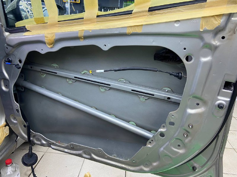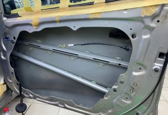 Начинаем работу с разборки дверей, подготовки поверхности и обезжириванию. Все работы по демонтажу пластика выполняются специальным инструментом. Мы гарантируем целостность клипс, креплений и отсутствие различного рода царапин, задиров на обшивках.