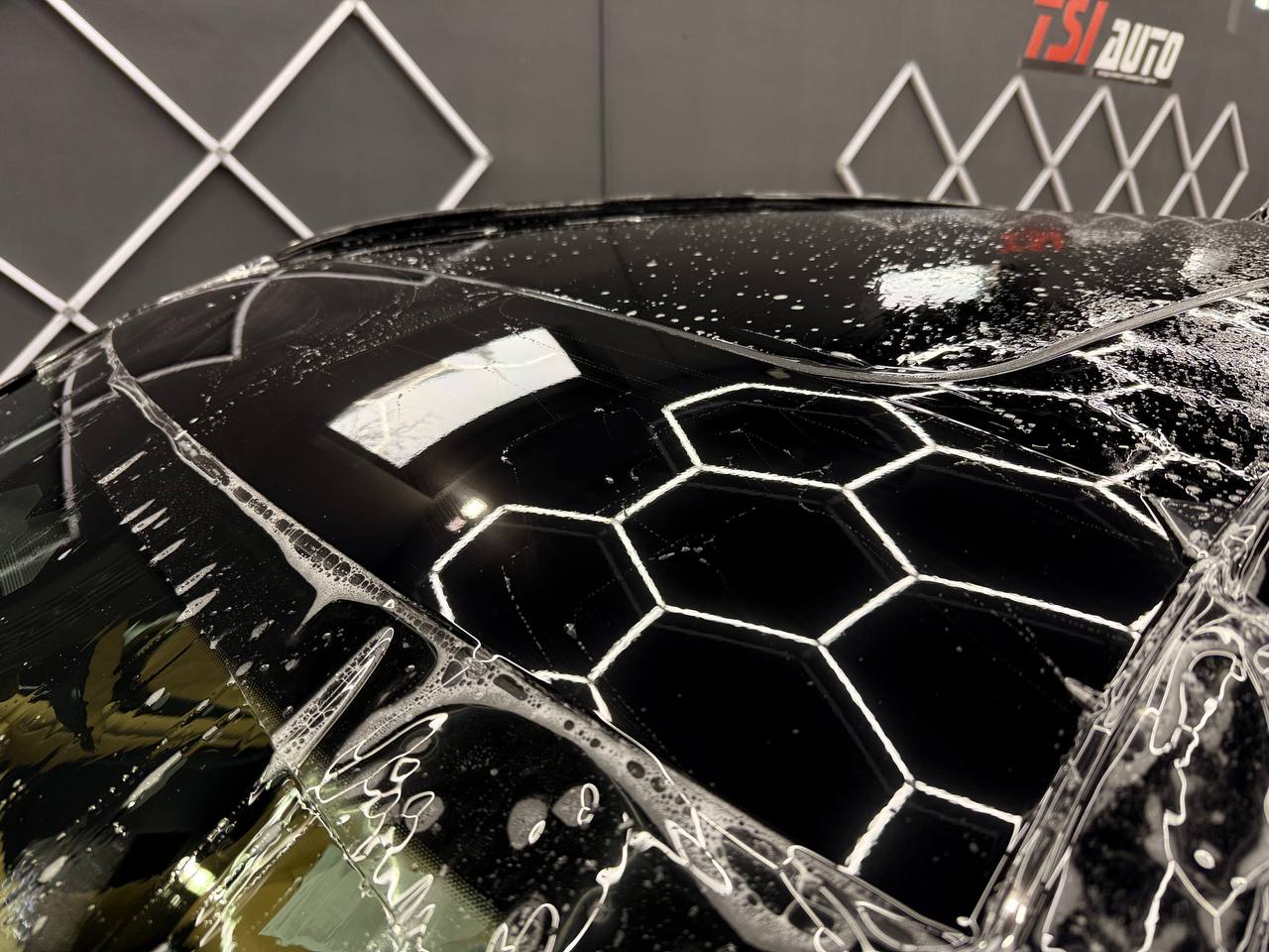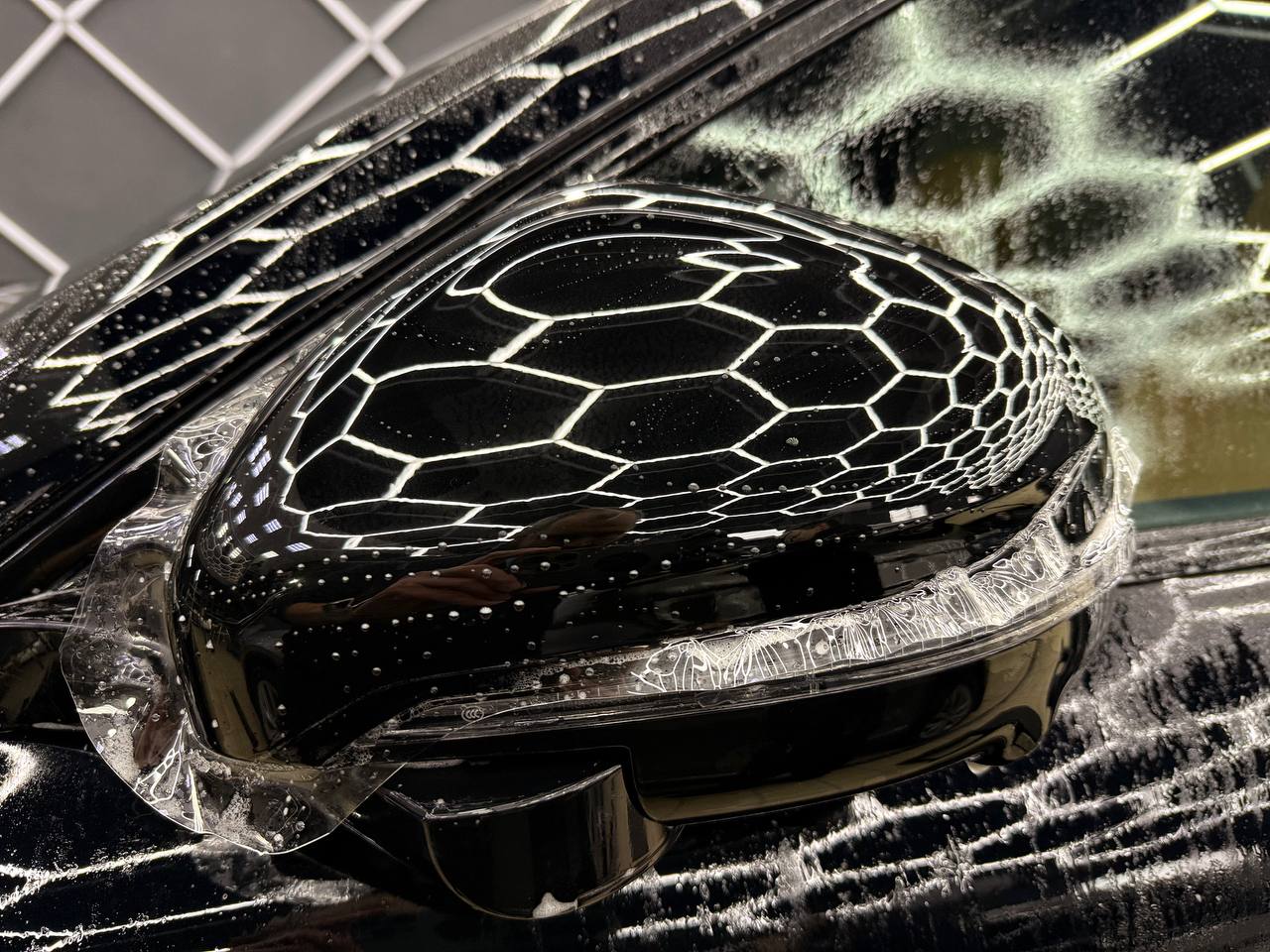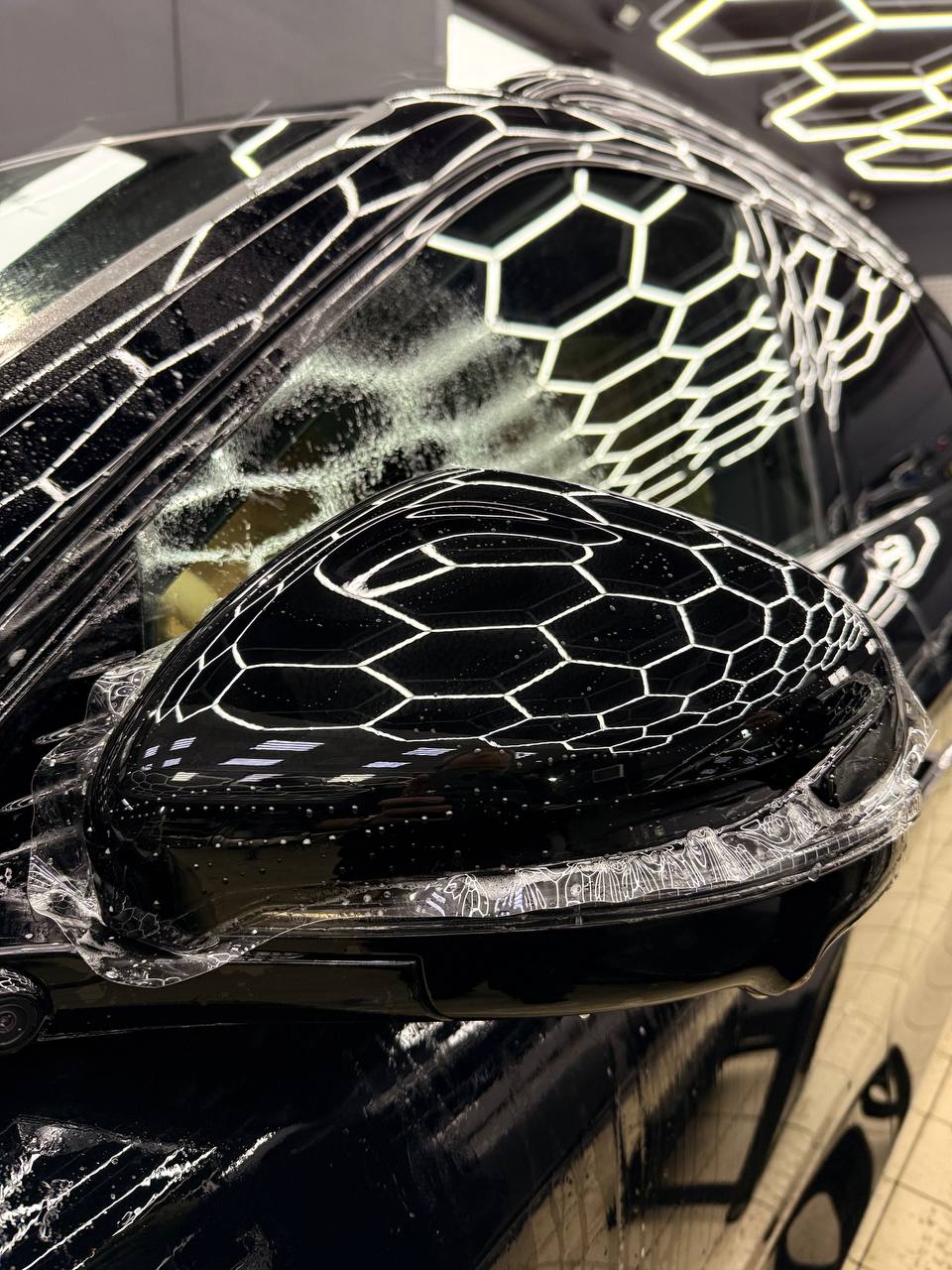 Далее не о процессе, а о конечном результате который получается на данном авто. Автомобиль будет меньше пачкаться, пленка обладает высоким гидрофобным эффектом и грязь не будет задерживаться на кузове. Ну и самое главное это защита, каждый оклеенный элемент выполнен с подворотом пленки по периметру. Сколы и царапины больше не угрожают ЛКП данного автомобиля, и если вдруг произойдет неприятная ситуация с мелким ДТП к примеру во дворе, с большей долей вероятности этот вопрос решиться заменой пленки на отдельном элементе. Так же автомобиль обрел на долго гарантированный блеск, так как пленка имеет самозаживляющий эффект и мелкие риски и царапинки будут затягиваться под воздействием температуры.